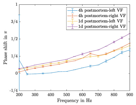 The increase of driving frequency leads to an increase of the phase shift following almost a linear relation; this can be seen in Figure 16. The measurement of the left VF four hours postmortem shows the same linear trend with in general lower values.