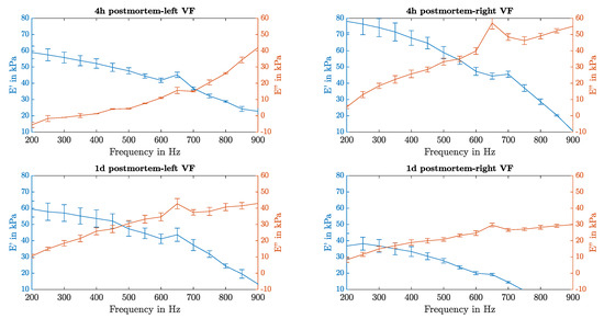Regarding the evolution over time, on both VFs a flattening of the loss modulus in higher frequencies can be seen in the data taken 1 d postmortem. Furthermore, it can be noticed that the frequency where the storage and the loss modulus crosses is not the same between VF pairs and this crossing shifts into lower frequencies for measurements taken 1 d postmortem.