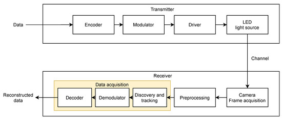 Regarding the receiver, Figure 1 shows the general scheme, composed of the camera, the preprocessing system, and the data acquisition system, consisting of the demodulator and the decoder.
