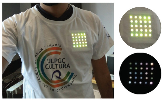 The expected use case of this transmitter is related to wearable devices. In Figure 3, an example of the transmitter placed behind a T-shirt is shown. In addition, on the right side of the image, the transmitter’s effect is observed by lowering the exposure time.