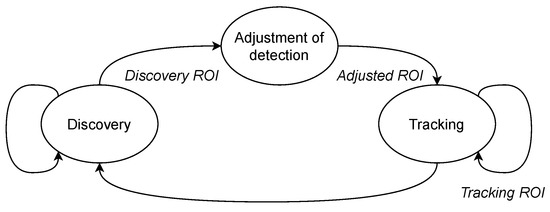 The state diagram in which the receiving system is before the decoding stage is shown in Figure 4. Initially, the system discovers the ROI within the first image containing the transmitter. For future references, this ROI would be identified as discovery ROI. If the source is not detected, the system returns to the discovery state successfully. This process is performed until the source is discovered when the receiver enters a tracking state. For tracking initialization, the system adapts the discovery ROI slightly and provides it to the tracking algorithm. This initialization ROI is called selected ROI. As new images are acquired, the receiver will attempt to locate the image’s source location based on the previously stored position using the tracking algorithms. The ROI delivered by the tracking algorithms is known as tracking ROI.