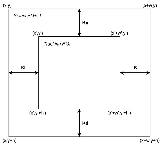 Under perfect conditions, the selected ROI and the tracking ROI should coincide to a large extent. It should stay centered and maintain its relative size of delta pixels on all edges. However, as was aforementioned, deterioration is accentuated over time. To evaluate this deterioration, the difference in distance between the edges of both ROIs it analyzed. These distances are identified as K parameters shown in Figure 6, which coincide with the upper, lower, left, and right separation (in pixels) of each ROI. These parameters are summarized in Equation (3).