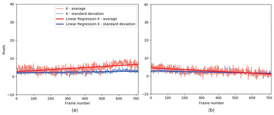 Based on these results, the study of the K parameters will be focused exclusively on the median flow tracking algorithm. The results, divided into lateral, diagonal, and frontal movements, are presented and discussed below. Finally, the results for the Student’s t-test are presented.