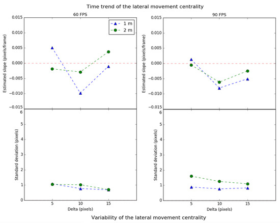 In Figure 9, the upper part shows the time trend of the lateral movement scale, while the lower part shows its variability. The left graph shows the values for a framerate of 60 FPS, for each delta, at 1 m (triangle) and 2 m (circle). The right graph shows the same parameters for 90 FPS. On the other hand, Figure 10 presents the lateral movement centrality values in the same format.