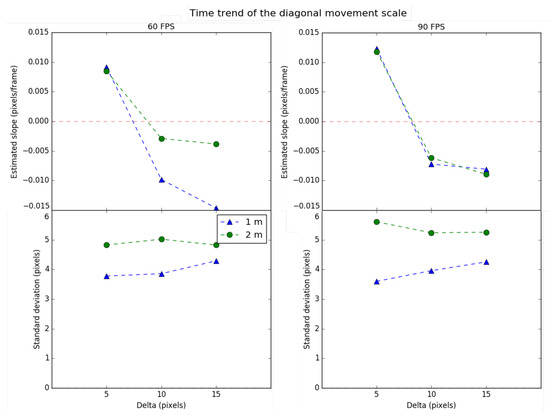 Regarding the time trend of the scale in the lateral movement, it can be observed that, in most cases, the values tend to zero, which means that the system behaves in a relatively stable way. The scale’s trend deviation meets a similar behavior regardless of the chosen starting delta (each value is close to 2 pixels). This indicates that the system’s lateral movement performance is not significantly affected by the parameters of distance, delta, and FPS. Since the trend deviation is relatively low, the selected delta of 15 pixels would prevent the tracking from losing the source for a more extended period, since the time trend scale is closer to zero for both distances.