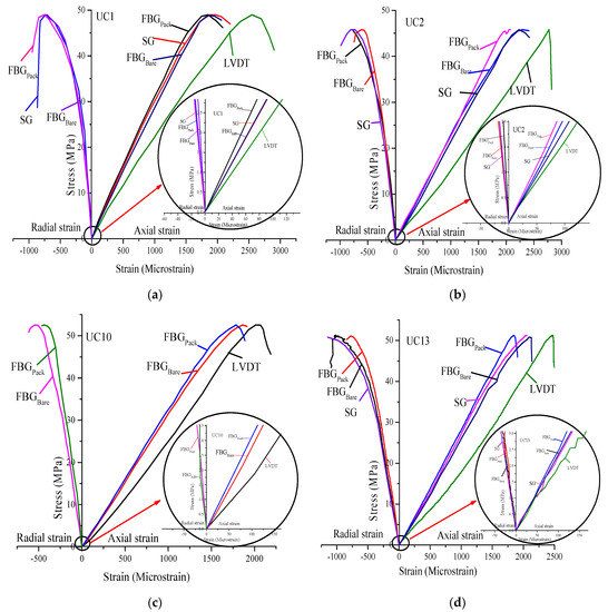 The stress was plotted against the axial and radial strain response recorded by FBGBare, FBGPack, SG, and LVDT. A total of 6 specimens were tested, readings from all sensors were recorded, and the results are presented in Figure 6, with each response designated by a distinct color.