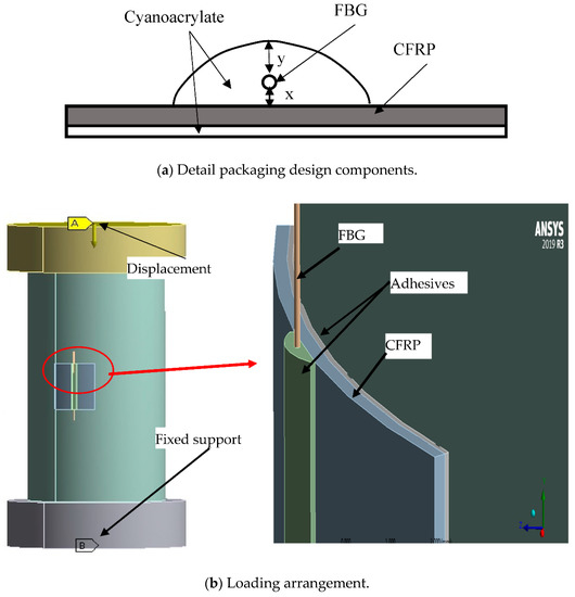 The FBG packaging was designed as shown in Figure 8a. The shape of the adhesive on top of the CFRP was presumed to be elliptical, having 2 mm width, and the FBG was immersed in the adhesive. The top adhesive thickness is designated as y, while the bottom adhesive thickness is x. The thickness of CFRP and the adhesive that attached the package sensor on the rock were kept at 0.3 and 0.1 mm, respectively. During the FEM, displacement was applied at the top plate incrementally, and the base plate was kept as fixed support. The model elements, meshing, loading, and FEM analysis are shown in Figure 8.