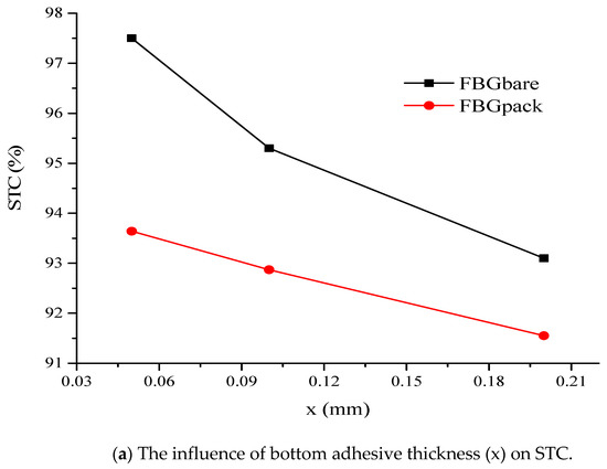 Furthermore, the comparison of STC between the FBGBare and FBGPack demonstrated that FBGBare was more sensitive than FBGPack (Figure 10). This may be attributed to the presence of the packaging layer in the case of FBGPack. Figure 10a compare FBGBare and FBGPack based on the variation of the bottom thickness (x), while the effect of varying the adhesive thickness between FBGBare and limestone, CFRP and limestone are shown in Figure 10b, respectively. It is important to note that the bottom thickness was the same as the thickness between the FBG and limestone for FBGBare. STC reduced with the increase in adhesive thickness.