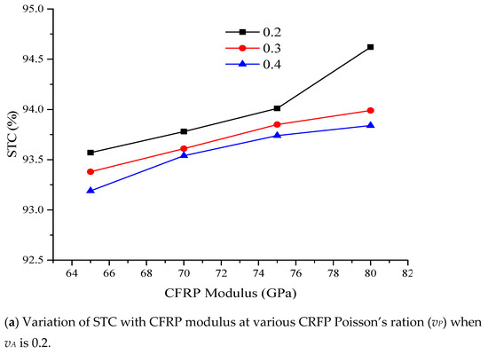 Figure 11 shows the variation of STC as a function of packaging modulus and Poisson’s ratio (vP) at different values of adhesive Poisson’s ratio (vA). In Figure 11a, vP varied as 0.2, 0.3, and 0.4, CFRP modulus varied as 65, 70, 75 and 80 GPa, while vA was kept constant (0.2). The same scenario was repeated for vA of 0.3. The sensitivity of the packaged FBG sensor rose with increasing CFRP modulus. STC declined with the rise in both vA and vP. This implies that the increase in the package modulus courses corresponding increase in the sensitivity of the sensor, while a rise in Poisson’s ratio of both adhesive and packaging material reduced the sensitivity of the sensor.