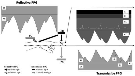 Basis of photoplethysmography (PPG) signal acquisition. LED: light-emitting diodes; PD: photodetector; A: other tissues; B: venous blood; C1: non-pulsatile component of artery blood; C2: pulsatile component of artery blood; AC: alternating current-the pulsatile part of the PPG waveform; DC: direct current—the steady part of the PPG waveform; AP: anacrotic phase; CP: catacrotic phase; DN: dicrotic notch.