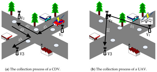Here, an example in Figure 1 shows the difference of data collection performance between the CDV and the UAV in practical driving environments. Assuming that three sensor nodes have buffer data which need to be collected and the collection order is : for the CDV, because the path is paved in advance, the traveling distance of the CDV is and the traveling time of CDV is . At the same time, in Figure 1a, the circle on the road indicates that the road is not smooth, which means that the actual traveling time will be greater than ; for the UAV (Figure 1b), because it can fly at a certain distance from the ground in the air to avoid the interference of ground obstacles, the traveling distance is and the travel time of the UAV is . , ; therefore, it can be easily determined that , which means that the UAV can more quickly reach the sensor node which needs to send buffer data and the data overflow can be reduced.
