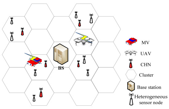 The set is defined to represent the set of heterogeneous sensor nodes which are deployed in the network area randomly. The battery capacity of each sensor node is defined as , where is the maximum battery capacity. For different sensor nodes, is a random value selected from the interval , which means that sensor nodes in the network have different battery capacities. is used to denote the residual energy of sensor node at time . It can be observed that . is the energy consumption of sensor node . The residual lifetime of can be defined as . The buffer of sensor node is also different and is defined as , where is the maximum buffer. The coordinate of each sensor node can be written as . The base station is located in the center of the network and is responsible for receiving and processing the data from the MV or the UAV. Assuming that the battery capacity of the base station is infinite, can be used to represent the least energy level of each sensor node, where is the minimum energy level. To make charging and collection more efficient, the network is divided into clusters based on the cellular structure in [18], and the CHN is dynamically selected according to the residual lifetime and the location during each period (which will be discussed later). Other sensor nodes will send their buffer data to the CHN in the same cluster, and then the CHN transmits the whole dataset to the MV or the UAV or the base station. The set of all clusters is defined as . An example is shown in Figure 2.