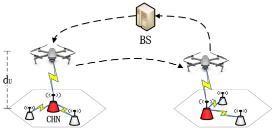Recently, UAV-enabled data collection, which avoids complex road environments and has higher speed and lower traveling costs, is becoming more and more popular [29,30]. Due to its inherent attributes, such as high flexibility, high mobility, and adaptive altitude, UAVs have been proven as an efficient solution to collect data from these networks [31]. Furthermore, because a UAV can hover at some altitude above the ground, it can also provide reliable downlink and uplink communications [32]. When suffering from serious natural disasters, [33] showed that, instead of communication vehicles which are heavy and greatly affected by bumpy roads, using UAVs is more likely to keep local networks connected in a cost-effective way. In practical business, one company—DJI UAV—has shown that the battery capacity of a normal UAV is 5870 mAh, the speed of a UAV can reach 15 m/s, and the longest flight of 30 min can be achieved [34]. This description indicates that the performance of a UAV in data collection is better than that of terrestrial vehicles, especially when road conditions are complex. If used to assist data collection of an MV, data overflow caused by inherent limitations of CDVs, which include slow speeds, restrictions by the environment, and short effective working times, could be further reduced.