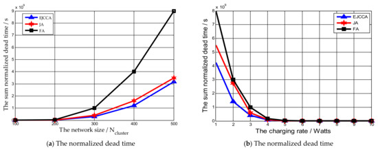 In Figure 4a, the network size ranges from 100 to 500 , while the charging rate of the MV is , the data collection rate is , and are set as 0.5, 0.3, 0.2, 0.7 and 0.3, respectively. Figure 4a shows that with the increase in the network size, the sum of normalized dead time delivered by the mentioned algorithms is increased. The reason is that with the growing number of sensor nodes in the network, the number of sensor nodes needing charging is also increased. Thus, the MV may not charge them in a timely manner, which will result in the death of sensor nodes. At the same time, it should be noted that the sum of normalized dead time delivered by our proposed algorithm was less than that by other two algorithms. This is because algorithms FA and JA take the traveling distance of the MV and the residual lifetime into consideration, while our proposed algorithm just focuses on the lifetime of the network. Figure 4b indicates the impact of charging rate of the MV on the sum of normalized dead time of network. The charging rate is from to , while the network size is the and the data collection rate is . It can be found that with the increase in the charging rate, the sum of normalized dead time delivered by algorithms EJCCA, FA, and JA are reduced sharply. The reason behind this phenomenon is that more sensor nodes can be charged when the time spent on charging sensor nodes is decreased. Meanwhile, the sum of normalized dead time by our algorithm is still less than that by others.