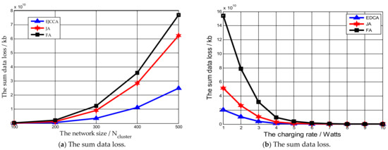 The influences of different parameters on the data loss are shown in Figure 5. In Figure 5a, the impact of network size on the data loss is studied, where the network size is from 100 to 500 , while the charging rate of the MV is , the data collection rate is , and are set as 0.5, 0.3, 0.2, 0.7 and 0.3, respectively. Notably, the amount of data lost increased with the increase in the network size. This is easy to explain: a greater network size means that more sensor nodes will need to send buffered data, but the number of the data collectors (e.g., the MV and the UAV) is limited in practical, thus some buffer data will not be collected in time by the MV and the UAV, eventually leading to data loss. It can also be seen that the data loss by our proposed algorithm is minimal comparing with others. This is because in this study, the practical network environment is considered; the utilization of the mobile vehicle to collect buffered data in algorithm JA is not reasonable. To avoid obstacles on the traveling path, a flexible and light UAV is applied. Thus, the buffer data of sensor nodes can be collected in a faster way and the data loss of the network can be considerably reduced. Figure 5b shows the performance of algorithms by varying the charging rate from to , while the network size is and the data collection rate is . It can be observed that with the increase in the charging rate, the data loss amount is reduced. This is because with the decrease in time spent on charging each sensor node, more sensor nodes can be charged and collected during the charging period. The amount of data lost by our proposed algorithm is less than that by others. For example, when the charging rate is , the amount of data lost through the other simulated algorithms EJCCA, FA and JA was , and , respectively. At the same time, it could also be found that with the increase in the charging rate, the difference between the above algorithms became smaller.