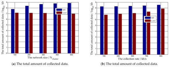 We also investigated the impacts of network size and the collection rate on the amount of collected data delivered by our proposed algorithm. In Figure 6a, the network size is from 100 to 500 , while the charging rate of the MV is , the data collection rate is 500 kb/s, and are set as 0.5, 0.3, 0.2, 0.7 and 0.3, respectively. It can be found that with the increase in the network size, the amount of collected data by the MV becomes greater. Here, there is an interesting phenomenon: with the increase in the network size, the amount of data collected by the UAV decreases slightly. The reason behind this is to avoid interference between the MV and the UAV, we assume that the UAV is just responsible to collect buffered data away from the charging path, i.e., clusters which the UAV serves do not include clusters needing charging or neighboring clusters. When the network size becomes larger, more clusters will become in need of charge and more clusters will become neighboring clusters. Thus, the number of other kinds of clusters which send buffered data to the UAV will decrease. In Figure 6b, the data collection rate of the MV and the UAV range from 100 kb/s to 900 kb/s, while the network size is and the charging rate of the MV is 5 Watts. Obviously, with the increase in the data collection rate, the amount of data collected by the MV and UAV increases.
