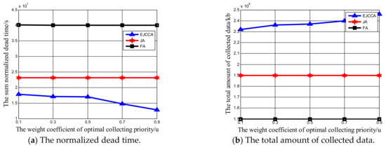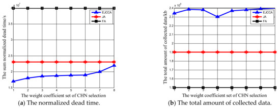 Impacts of five weighting factors on network performance were also analyzed. Notably, that there are many combinations of different sets of weighting factors. In order to simplify simulations, only some values were used for analysis. The network size was 200 , the charging rate of the MV was , and the data collection rate was . Furthermore, it is worthwhile pointing out that other algorithms do not use weighting factors to determine optimal CHNs or collecting priority. Hence, the normalized dead time and total amount of data collected by algorithms FA and JA are constant. First, for , different values are listed in Table 3, while the weight coefficients of optimal collecting priority, , are 0.7 and 0.3, respectively. From Figure 7a, it can be determined that when the weight coefficient set of CHN selection is 1, i.e., are 0, 0 and 1, respectively, the sum of normalized dead time delivered by our proposed algorithm reaches the minimum value, . The reason is that the residual energy plays a more important role in CHN selection than other factors. A sensor node with more energy will be selected as the CHN. The energy consumption of the CHN is greater than other sensor nodes in same cluster; because the CHN has enough energy, the heavy data transmission work will not cause the early death of it. At the same time, when the weight coefficient set of CHN selection is 8, i.e., are 0, 1 and 0, respectively, the sum of normalized dead time reaches the maximum value, . This is because in the selection of the CHN, the buffering of the sensor node plays the most important role. Hence, the selected CHN will have a larger buffer but less residual energy. Heavy data transmission will lead to early energy depletion. At the same time, with the increase in x label, it can be found that the sum normalized dead time with our algorithm also increased. The weighting factor decreases; therefore, a certain sensor node whose residual energy is not the highest will be selected as the CHN. It is also obvious that with the increase in x label, the normalized dead time delivered by the proposed algorithm EJCCA will always be less than that by algorithms JA and FA. In Figure 7b, the total amount of collected data is maximum when the weight coefficient set of CHN selection is 8, which means that more data can be collected when are set as 0, 1 and 0, respectively. The reason is the chosen CHN has larger buffer, and more data can be cached before the data collector comes. Meanwhile, note that the total amount of collected data by set four is less than that by set one. This is because the normalized dead time by set one is less than that by set four, which means that the data collector can collect data for a longer time. When the sequence of the x label is 8, 7, 2, 6, 3, 5, 1, 4, it can be observed that the total amount of collected data decreased monotonously. The reason is that when the sequence of the x label is 8, 7, 2, 6, 3, 5, 1, 4, the weighting factor is also decreased, which means that less data can be buffered before the mobile data collator arrives. Meanwhile, note that the performance of our algorithm was always better than that of others when the weighting factors varied. Then, for , ranges from 0.1 to 0.9 and ranges from 0.9 to 0.1 accordingly, while the weight coefficients of CHN selection are 0.5, 0.3 and 0.2, respectively. From Figure 8a, it can be found that with the increase in the weighting factor and the decrease in the weighting factor , the sum of normalized dead time is decreased. Moreover, the normalized dead time achieved by the proposed algorithm EJCCA was always less than that by algorithms JA and FA. At the same time, in Figure 8b, with the increase in the weighting factor and the decrease in the weighting factor , the total amount of collected data was also increased. The reason behind the above phenomenon is that the buffer is the main factor which influences optimal collecting priority. When clusters have a larger buffer, more data can be buffered and collected. Meanwhile, more data collected by the data collector means less energy consumed performing long-range data transmissions. Hence, the normalized dead time can be reduced. Meanwhile, it is worth pointing out that when the weight coefficient of optimal collecting priority varies, the total amount of collected data delivered by our algorithm is always better than other algorithms.
