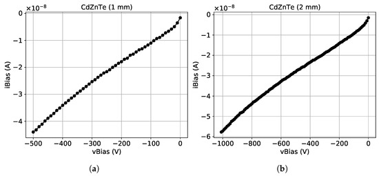 As described above, the sensor pixel array is surrounded by a guard-ring. It is worth mentioning that for both sensors the connection of the guard-ring was not established. The measured current values in this case are assumed to be the sum of the leakage currents of each pixel. During this measurement, the Timepix chip is powered on while the sensor is at room temperature and protected from ambient light. The measured IV curves for the 1 thick and the 2 thick sensor are shown in Figure 5a,b, respectively.