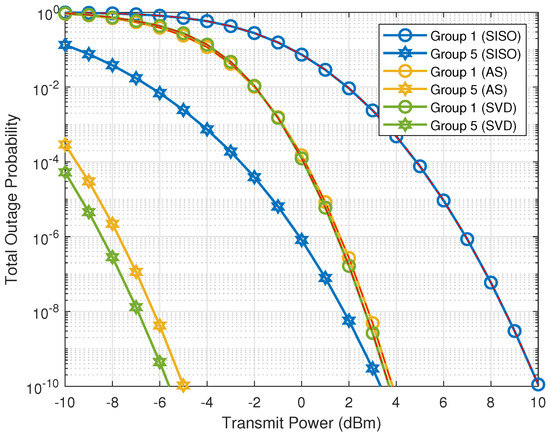 First, we consider the case where the transmit power is fixed, i.e., excluded from the optimization problem in (21a). Figure 3 shows the total outage probabilities of SISO, AS and SVD transmission schemes when ξ i j = 1 and n = 2 antennas. To facilitate the visualization only the groups S g , 1 and S g , 5 are shown, formed, respectively, by the farthest and closest nodes with respect to S d . As we observe, the difference in terms of outage probability for AS and SVD is very small, especially when considering group S g , 1 . Therefore, the outage threshold P o (marked as the dashed red curves in Figure 3) in the optimization is established as the outage probability of group S g , 1 when ξ i j = 1 , which may be different for each employed transmission scheme. In other words, P o = max i { P i } : ξ i j = 1 , { i , j } S .