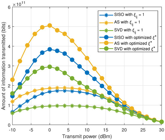 Figure 4. Amount of information transmitted by SISO, AS and SVD with n = 2 antennas, comparing the cases with ξ i j = 1 and optimized ξ i .