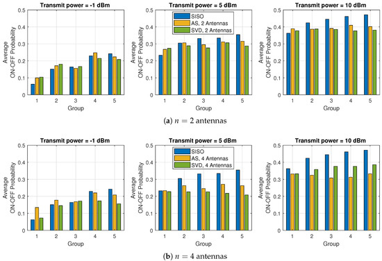 Next, we plot the average ON–OFF cooperation probability for each of the five groups of nodes in Figure 5, considering n = 2 antennas in Figure 5a and n = 4 antennas in Figure 5b, in each sensor node. As mentioned above, when P i , φ increases, the P o constraint decreases and the groups tend to cooperate more often. On the other hand, by increasing the number of antennas (comparing Figure 5a with Figure 5b), the ON–OFF probability decreases due to the higher diversity order provided by n. In addition, notice also that SISO has a higher impact in terms of the optimization of ξ i when P i , φ increases than AS and SVD. Although SISO is also cooperative and experiences spatial diversity by the use of the relays, the multiantenna schemes have an additional degree of diversity, which impacts the ON–OFF optimization. When the transmission power increases, the outage probability threshold decreases, since P o = max i { P i } : ξ i j = 1 , { i , j } S . This is the reason the cooperation probability increases with the transmit power, which usually demands more from the nodes closer to the destination. Therefore, by increasing the spatial diversity employing multiantenna schemes, we can increase sleep states of the nodes as well as we allow more opportunities for nodes more distant to the destination to cooperate with other nodes.