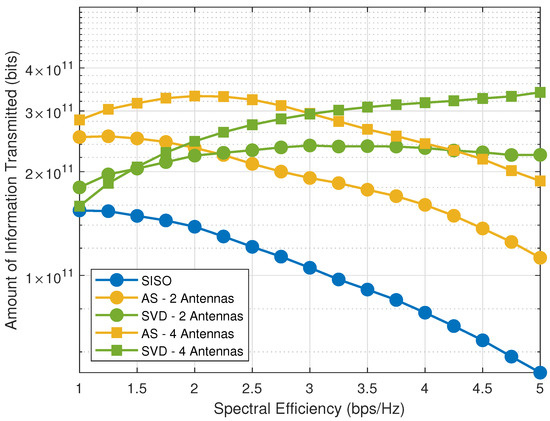 Figure 6 plots the amount of information, with optimized P φ and ξ i , as a function of the side of the squared area (D). As we observe, the AS scheme outperforms the other schemes is most situations. In a complementary way, Figure 7 investigates the amount of information as a function of the system spectral efficiency, in which we observe that AS performs better for smaller spectral efficiencies (up to 2.2 bps/Hz with n = 2 antennas and up to 3 bps/Hz with n = 4 antennas), while SVD has increased performance when the spectral efficiency increases.