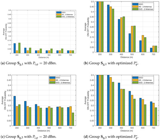 Table 3 shows the relative gain, in terms of amount of information, of the power optimization method with respect to the case of fixed transmit power, with P i , φ = 20 dBm. The optimization of the ON–OFF probability is carried out in both cases. As we notice, for short distances, the gain in selecting the best transmit power for short distances is quite important, with an increase of up to 80 % in the number of bits transmitted by the network. This result is complemented by Figure 8, which shows the average ON–OFF probability with fixed and optimized transmit power of groups S g , 1 and S g , 5 . As we observe, the transmit power allocation considerably decreases the ON–OFF probability, i.e., saving energy from the relays which tend to be in sleep mode more often, increasing the amount of information with the proper power allocation.