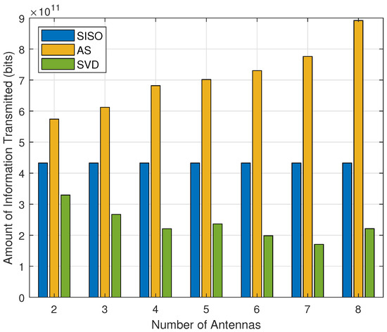 Finally, Figure 9 analyzes the amount of information as a function of the number of antennas at the sensors, for D = 200 m. As observed, the amount of information transmitted by the network always increases with n for the AS scheme, regardless of the transmit distance, while, for the SVD scheme, n = 2 maximizes the amount of information when D = 200 m. Furthermore, when D increases, SVD presents an optimal number of antennas that maximizes the amount of information. This is due to the energy consumption of the RF chain required by each antenna, so that AS selects a single pair of antennas to remain active at each transmission, while all RF chains are transmitting/receiving with the SVD scheme, increasing the energy consumption and reducing the network lifetime.