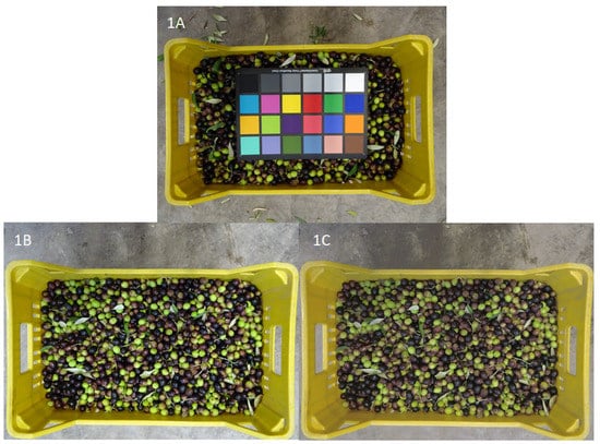 In this study, the olive lot analyzed for ripeness degree definition (without considering the pulp as in the Jaén index) was directly photographed at harvest time, after positioning the olives in stackable plastic trays. It is at this part of the harvesting process when the potentially rapid real-time machine vision method could be applied in practice, once implemented. Furthermore, the analytical technologies used were made objective and repeatable thanks to the automatic colorimetric calibration method, which consists of the management of simple RGB images by calibrating their colors on the basis of the 24 patch values of the GretagMacbeth ColorChecker. The original images were processed using pixel values classified by thresholding and a segmentation algorithm, as an artificial vision technique for the automatic detection of the external quality of olive fruits [28]. In addition, even if the accuracy is 60%, the automatic method developed in this study could compensate for both human eye error and objectivity, as the definition of the ripeness degree of olive lots is currently assessed only by eye, as per the Jaén index.