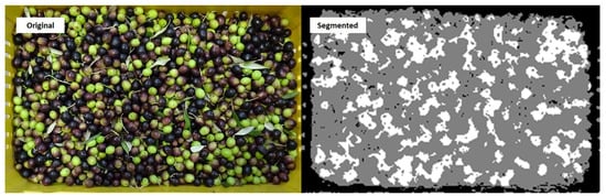 The classification of pixels allowed for the image segmentation shown in Figure 2, where white pixels correspond to ripe olives (black), gray pixels are associated with the unripe olives (green), and black pixels correspond to the other classes (red and yellow trays, leaves, background, and purple olives). Afterwards, the white pixels were counted, and the percentage of ripe olives was estimated by dividing the number of white pixels by the number of pixels associated with the black, green, and purple olives.