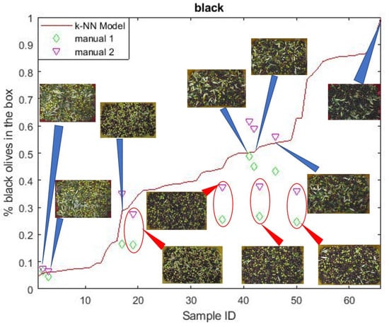 This is probably due to the variability of the olive area aspect ratio across the samples. This problem could be easily overcome in future applications by means of a steady support for the camera. A further source of error comes from the misclassification of green olives, classified as “leaves”. When this happened, the percentage of green olives decreased in favor of the black olive percentage. As some trays had fewer leaves than others, the probability of green olives of being misclassified was not uniform across the samples. The four samples whose percentage of black olives was overestimated by the algorithm had fewer leaves (cleaner trays in Figure 3). This artefact can be easily corrected by cleaning the olive trays before classification, or at least making the percentage of leaves uniform across the different olive trays. This would ensure that the probability of misclassifying a green olive as a “leaf” is uniform for all trays, and the resulting systematic error could be easily eliminated by dividing for the maximum percentage.