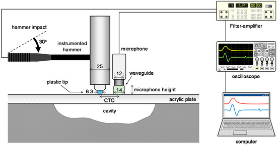 Sound waves were generated by impacting a modeled acrylic plate using an instrumented hammer (086D05, PCB Piezotronics, Depew, NY, USA), as shown in Figure 1. A load cell was embedded in the instrumented hammer. Thus, the load applied to the acrylic plate at the time of impact could be calculated based on the maximum amplitude of the measured load signal. A plastic tip was attached to the hammer to serve as a cushion at the moment of impact. The diameters of the hammer and plastic tip were 25 mm and 6.3 mm, respectively, and the weight of the hammer was 10.8 N.