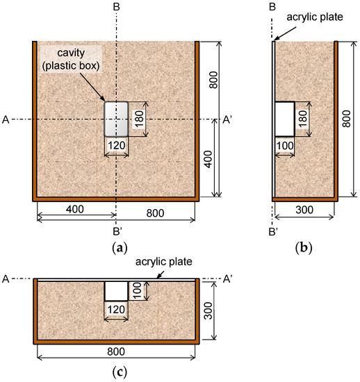A chamber containing soil and a model cavity was prepared, as shown in Figure 2, to simulate a cavity beneath the asphalt pavement. The asphalt pavement was modeled using an acrylic plate because the elastic modulus of the acrylic plate is similar to that of asphalt pavement (approximately 3 GPa) [22]. Figure 2a–c shows the front view of the chamber, the side view in section B–B’, and the bottom view in section A–A’, respectively. The dimensions of the chamber are 800 mm in length, 800 mm in height, and 300 mm in width. A square acrylic plate with 800 mm sides was installed in front of the chamber as shown in Figure 2b. Two acrylic plates with thicknesses of 8 mm and 15 mm (T = 8 and 15 mm) were used to evaluate the effect of the plate thickness.