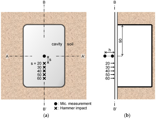 During the measurement of sound waves using an air-coupled microphone, the signal is affected by the microphone height and the center-to-center spacing between the hammer and microphone [15,23]. As the air-coupled microphone height from the ground increases, the main frequency of the sound wave decreases relative to that measured using the ground-coupled sensor [23]. In addition, as the center-to-center spacing between the hammer and microphone becomes narrower, the inspection area by the microphone becomes narrower, and the spatial resolution of the measurement result increases [15]. The sound waves were measured while adjusting the microphone height (h) and the center-to-center spacing between the hammer and microphone (s) to determine the optimal values for each variable. An experiment for determination of h and s was performed on the B–B’ line, at the cavity section with a 15 mm thick acrylic plate, as shown in Figure 3. The measured sound wave in units of mV was normalized by the load in units of N measured by the instrumented hammer at each impact to remove the effect of the impact energy.