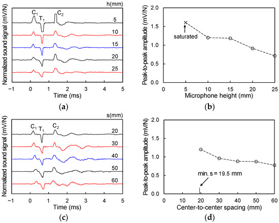 To determine the effect of the microphone height on the measured sound wave, the sound waves were measured while maintaining the spacing (s) constant and adjusting only the height (h). Considering the diameter of the hammer and the waveguide (25 mm and 14 mm, respectively), the minimum value of s was 19.5 mm (i.e., when the hammer and the waveguide were in contact). Thus, the initial fixed value of s was set as 20 mm for convenience as shown in Figure 3, and the sound waves were measured by adjusting h from 5 to 25 mm in 5 mm increments (Figure 3b). For the height (h) determination tests, the first wave crest and the first wave trough (C1 and T1, respectively in Figure 4a) appeared at approximately 0.06 ms and 0.5 ms, respectively. The normalized peak-to-peak amplitudes between C1 and T1 according to the microphone height are plotted in Figure 4b. Note that at the h = 5 mm, the value of T1 was saturated as shown in Figure 4a. At h = 10 mm, the sound wave was clearly measured without saturation, and thus the microphone height was fixed to 10 mm in this study.
