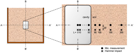 The chamber was filled using dry sand with a median particle diameter (D50) of 0.63 mm, specific gravity of 2.65, and friction angle of 36°. The dry sand was compacted in the chamber at a relative density of 64%. The compaction was carried out by dropping a hammer with a weight of 24.5 N and a diameter of 50 mm. The hammer was dropped 50 times for each layer from a height of 500 mm. The thickness of each layer was 100 mm, and the chamber was prepared in eight layers. The cavity was simulated by placing a plastic box because the distance between the measurement location and the edge of the cavity can be clearly defined for a scan line (one-dimensional) test [19]. The dimensions of the cavity are 120 mm in length, 100 mm in width, and 180 mm in height between the acrylic plate and the soil, as shown in Figure 2a,b. The cavity was positioned at the center of the acrylic plate as shown in Figure 2a.