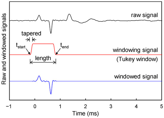 The sound wave measurements were conducted at a total of ten locations (six and four locations at the cavity and soil sections, respectively) along the A–A’ line as shown in Figure 5. The measurement locations at the cavity section were placed from 0 to 50 mm in 10 mm increments from the cavity center (L = 0–50 mm), and those at the soil section were placed 80, 100, 150, and 200 mm from the cavity center. Windowing was applied to the measured sound wave to analyze only the sound wave without the reflected Lamb wave from the boundary. As an example of the windowing application, the raw sound wave, measured at the measurement location of L = 0 mm for the 15 mm thick acrylic plate is shown as the “raw signal” in Figure 6. The Tukey window function (“windowing signal” in Figure 6) was applied to the raw sound wave [28], and the windowed sound wave (“windowed signal” in Figure 6) was obtained by multiplying the raw sound wave and the window function. A window length of 1 ms was applied for all raw signals, and the taper ratio was set to 0.2 as shown in Figure 6.