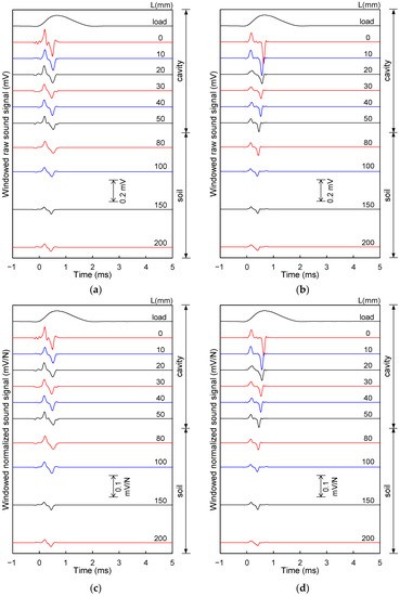 The raw sound waves at all measurement locations of the two acrylic plates with different thicknesses (T = 8 and 15 mm) are shown in Figure 7a,b. In addition, the windowed normalized sound waves by the hammer impact, i.e., the ratio of the windowed raw sound waves to the peak amplitude of the load signal due to hammer impact, are plotted in Figure 7c,d. According to Figure 7, the maximum peak-to-peak amplitude of the first wave crest and trough appeared at the measurement location of L = 0 mm, for both acrylic plates, and gradually decreased as the measurement location became farther from the cavity center. Thus, the peak-to-peak amplitudes of the first wave crest and trough at the cavity section are larger than that at the soil section.
