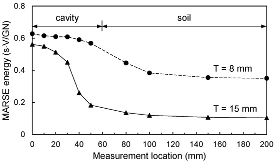 where ME is the MARSE energy; and g(t) is the amplitude of the signal with respect to time. Note that the MARSE energy has been used to analyze the attenuation of signal [31]. The MARSE energies calculated for the two acrylic plates are summarized in Table 1 and plotted according to the measurement locations shown in Figure 8. Figure 8 shows that the MARSE energy at the cavity section is higher than that at the soil section for both acrylic plates. When a cavity exists beneath a plate structure, the impact energy is conserved [32]. Furthermore, the estimated MARSE energy of the 15 mm thick acrylic plate was lower than that of the 8 mm thick acrylic plate for all the measurement locations. As the thickness of the plate structure increases, the maximum deflection and dynamic response of the structure generated by the hammer impact decrease [32,33]. Therefore, the maximum amplitude of the sound wave in the time domain decreases [34], and the MARSE energy decreased accordingly with an increase in the plate thickness.