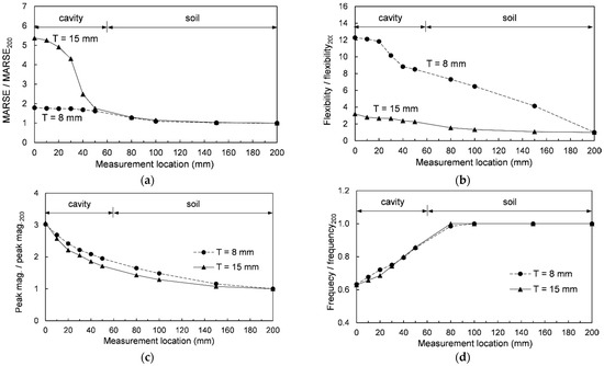 where T is the plate thickness; Ep is the elastic modulus of the plate, and νmedium and νplate are Poisson’s ratios of the medium and the plate, respectively. D is the longest dimension of the plate and Gmedium is the shear modulus of the underlying medium. At the cavity section, the MARSE energy decreased with increasing plate thickness as shown in Figure 8. However, at the soil section, as the thickness increased, the stiffness ratio increased, and thus the MARSE energy decreased. Thus, the normalized MARSE energy significantly increased with an increase in the plate thickness at the cavity section.