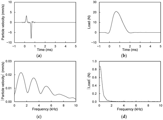 Load and particle velocity signals at measurement location of L = 0 mm for 15 mm thick acrylic plate: (a) particle velocity signal in time domain; (b) load signal in time domain; (c) particle velocity in frequency domain; and (d) load signal in frequency domain.