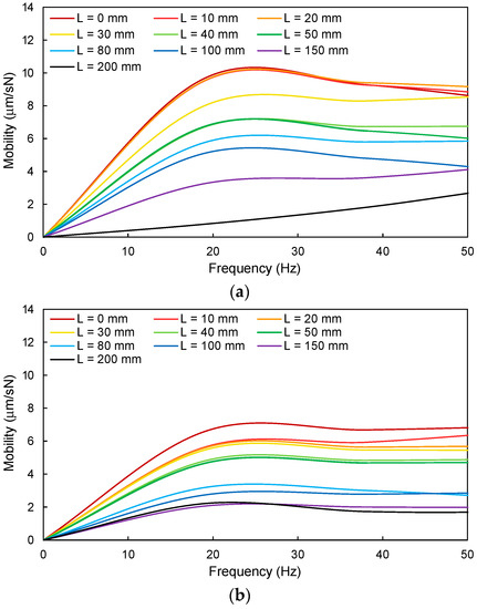 Mobility spectrum according to measurement location: (a) 8 mm thick acrylic plate and (b) 8 mm thick acrylic plate.