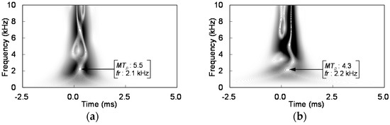The magnitude of the wavelet coefficient (MTp) and the frequency (fr) corresponding to the peak magnitude are presented in Figure 12. The peak magnitude and frequency corresponding to the peak magnitude of the wavelet transform for all measurement locations of the two acrylic plate thicknesses are summarized in Table 1. Table 1 shows that the peak magnitudes for the 8 mm thick acrylic plate were greater than those for the 15 mm thick acrylic plate at all measurement locations, because the energy transfer ratio from the hammer impact to the flexural vibration was higher for the thinner plate [18].