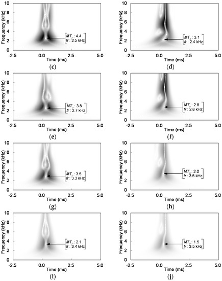 Wavelet transform of sound waves at selected measurement locations: (a) L = 0 mm for 8 mm thick acrylic plate; (b) L = 0 mm for 15 mm thick acrylic plate; (c) L = 20 mm for 8 mm thick acrylic plate; (d) L = 20 mm for 15 mm thick acrylic plate; (e) L = 40 mm for 8 mm thick acrylic plate; (f) L = 40 mm for 15 mm thick acrylic plate; (g) L = 80 mm for 8 mm thick acrylic plate; (h) L = 80 mm for 15 mm thick acrylic plate; (i) L = 150 mm for 8 mm thick acrylic plate; and (j) L = 150 mm for 15 mm thick acrylic plate.