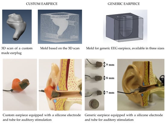 This study provides useful characteristics for ear-EEG, based on the 3D-scanning analysis of ear molds of two jaw end positions: opened and closed, which makes it possible to identify the optimized placement for the electrode within the earpiece. Moreover, the behind-the-ear piece was geometrically optimized and ergonomically designed to promote and maintain contact with the curved surfaces of the head around the ear without the need for a headband, adhesives or any of the other external equipment that is generally used with circum-aural EEG devices. In addition, the potential of conductive silicone, combining carbon fibers and medical-grade silicone rubber, is investigated as a promising material to make soft electrodes. A technique is proposed to standardize the manufacturing of conductive silicone electrodes and the molding process of the custom-fitted earpiece to produce an integrated and uniform soft electrode-earpiece structure dubbed EARtrodes: an intra-aural and circum-aural EEG device designed for BCI applications. Alternatively, a less customized and therefore more universal solution is also presented herein: fully conductive generic earpieces based on this conductive silicone electrode concept. For this study, these universal EEG earpieces were produced in three different sizes.