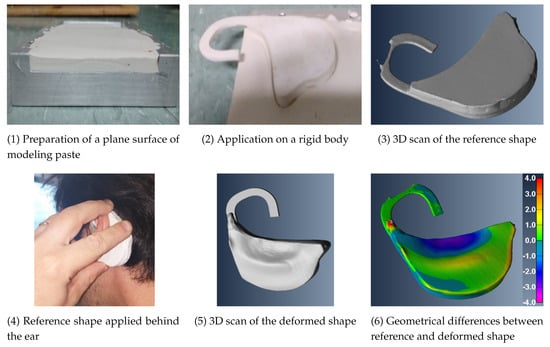 To record circum-aural EEG signals with the conductive silicone electrodes, a behind-the-ear piece is required to hold the electrodes in place and keep them in contact with the skin. The most important criterion here is that the device ensure steady contact between the skin and the electrodes for the entire duration of the EEG recordings. An anthropomorphic study was performed to characterize the shape of the device. To obtain the precise shape of the behind-the-ear area, the curved surface of the head around the ear was molded using a professional modeling paste as shown in Figure 3. Step 1: A plane surface of the modeling paste is placed on a table; step 2: a molding blank is prepared using a neutral rigid 3D-printed sample; step 3: the 3D scan of the blank to be used for later reference was obtained using an EinScan-S 3D scanner (Shinning3D, Hangzhou, Zhejiang, China); step 4: The molding blank was placed in its position around the ear and pressed onto the surface of the head using mild pressure to imprint the behind-the-ear area of the participant; step 5: The resulting impression was 3D scanned; and step 6: it was compared to the geometric reference plane of the modeling paste. The geometrical differences between the blank reference and the behind-the-ear impression describe the precise shape of the behind-the-ear area.