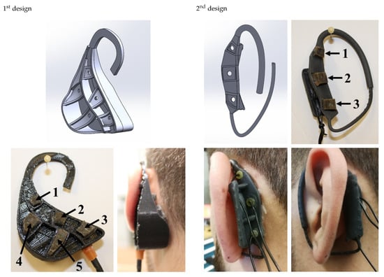 Initial (1st design on the left) and final (2nd design on the right) design of the behind-the-ear piece with embedded conductive silicone electrodes.