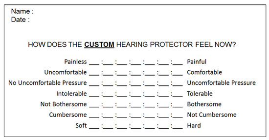 The main goal of this brief comfort study was to determine if there is a difference between the custom in-ear piece and the generic in-ear piece, in terms of comfort. Ten individuals (six males, four females) aged between 22 and 34 participated in this first study. Half of the participants were randomly assigned to first wear the custom in-ear piece and then the generic in-ear piece. The other half wore the generic in-ear piece first and then the custom in-ear piece. After 15 min of wearing time, the perceived comfort of each in-ear piece was subjectively assessed using a customized version of the bipolar comfort rating scales (Figure 6) developed by Park and Casali for hearing protection devices [25].
