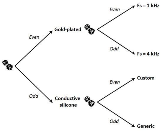 During all the measurements, participants remained seated on a comfortable ergonomic chair inside a double-walled audiometric booth. ASSR data were collected either using traditional gold wet electrodes or wet electrodes made of conductive silicone. The recording order was randomly determined for each individual participant using a six-sided dice and a tree diagram (Figure 7).