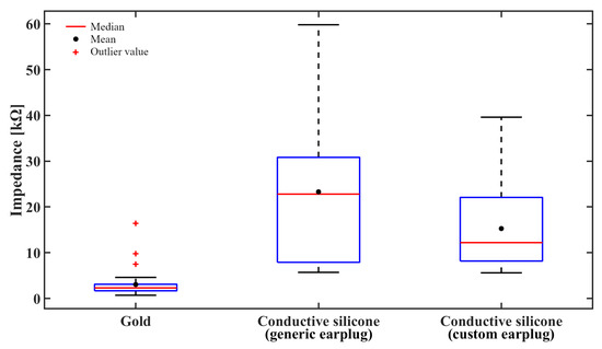 The interelectrode impedances presented in Figure 9 suggest that the impedances are much higher when using conductive silicone electrodes instead of gold-plated electrodes. A Friedman rank sum test [40] procedure confirms that gold-plated electrodes and conductive silicone electrodes are not equivalent with respect to impedances as this test rejects the null hypothesis at a 5% significance level (p = 3.773 × ).